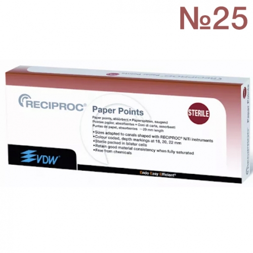 Для каждого инструмента RECIPROC (размеры R25, R40 и R50) существуют бумажные штифты RECIPROC, обладающие высокой абсорбирующей способностью.