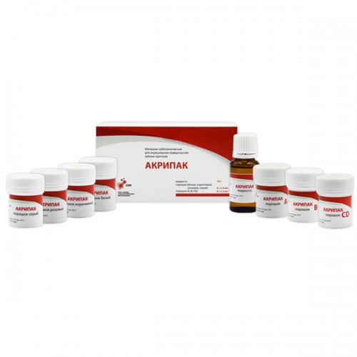 Материал «Акрипак» выпускается в виде двух компонентов - порошка, содержащего полиэфиры метакриловой кислоты, наполнители и пигменты, и жидкости, содержащей диметакриловый эфир триэтиленгликоля, после смешивания которых образуется паста, твердеющая при нагревании до температуры 220-2З0 0С.