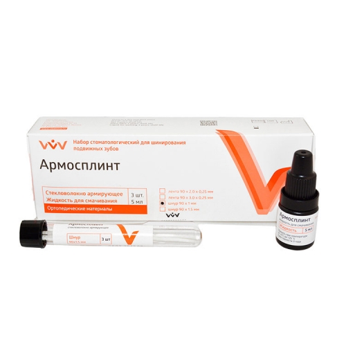 В набор «Армосплинт» входят: стекловолокно, жидкость для смачивания стекловолокна, текучий композит «ДентЛайт»- флоу, адгезивная система «Белабонд». Стекловолокно «Армосплинт» представляет собой ленту специального высокомодульного плетения. Основа ленты - стекловолоконные нити, оплетенные полиэфирными микроволокнами (ширина ленты 2,0 и 3,0 мм, толщина - 0,25 мм).