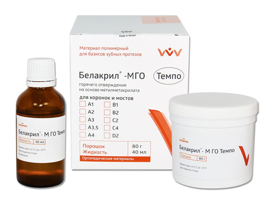 Материал «Белакрил»-М ГО Темпо выпускается в виде двух компонентов – порошка, содержащего полиэфиры метакриловой кислоты и жидкости, содержащей мономер метилметакрилат, после смешивания, которых образуется полимер, твердеющий при нагревании.