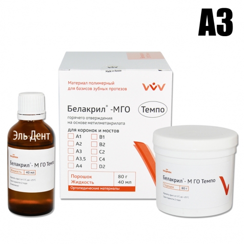 Материал «Белакрил»-М ГО Темпо выпускается в виде двух компонентов – порошка, содержащего полиэфиры метакриловой кислоты и жидкости, содержащей мономер метилметакрилат, после смешивания, которых образуется полимер, твердеющий при нагревании.