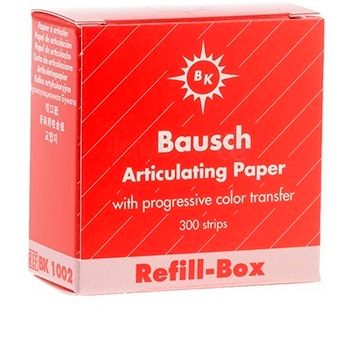 Bausch BK 1002 - это артикуляционная бумага Бауш прямая толщиной 200 мкм, с нарастающей интенсивностью цвета является единственным видом бумаги, позволяющим представить жевательную силу различной интенсивности в виде цветных отображений с оттенками, зависящими от величины нагрузки. После первичной обработки завышенных контактов следует в дальнейшем использовать более тонкие проверочные средства.