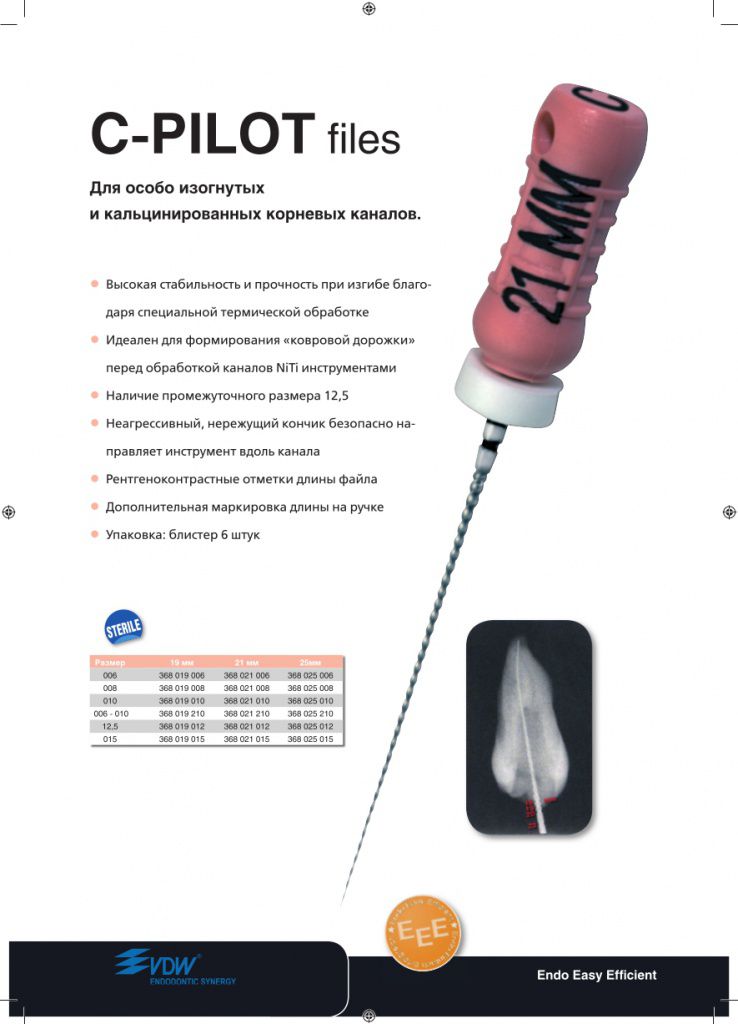 C-PILOT (Ц-Пилот) - это файлы для прохождения сильно искривленных и кальцифицированных каналов. Ц-Пилот файлы (C-Pilot files) Антэос (Antaeos) фасованные – эндодонтические инструменты предназначенные для эндодонтического лечения осложненного кариеса:
