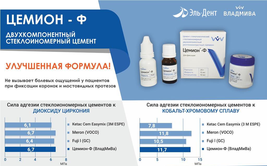 - «Цемион-Ф» рентгеноконтрастен, обладает высокой механической прочностью, низкой растворимостью, хорошей адгезией к эмали, дентину и к основным конструкционным стоматологическим материалам. Цемент обеспечивает хорошую краевую герметизацию, длительно выделяет фтор, что укрепляет твердые ткани зуба и предупреждает развитие вторичного кариеса.