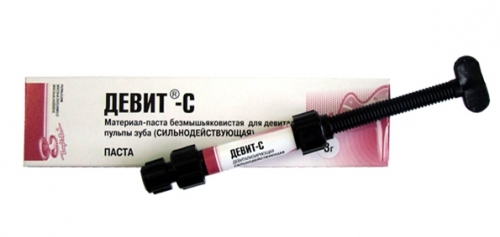 Применение пасты «Девит» - С обеспечивает пролонгированную девитализацию пульпы практически без раздражения и боли, а также исключает необходимость дополнительной обработки каналов с целью нейтрализации солей мышьяка, как в случае применения мышьяковистых паст.