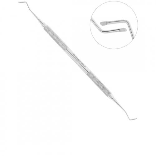 Каждая из симметричных рабочих частей двустороннего инструмента имеет форму овальной ложки с острыми краями, которые позволяют атравматично удалять размягченный дентин или эмаль из кариозной поверхности.