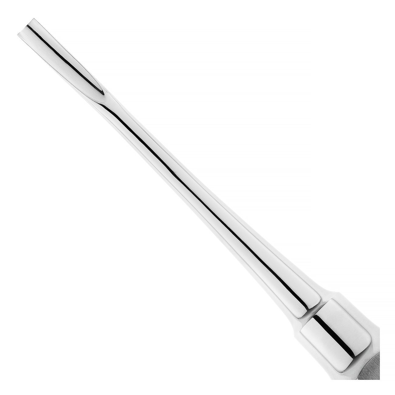 Элеватор HLW 13-10B Bein-Bajonett 4 мм, производства немецкой компании HLW Dental Instruments, предназначен для удаления корней и зубов на нижней челюсти. Щечка инструмента выполнена в форме штыковидного изгиба с шириной рабочей части 4 мм. Поверхность щечки элеватора, обращенная в момент экстракции к корню зуба, имеет желобовидное углубление и прямоугольную форму. Изогнутый инструмент удобен в использовании. Укороченная ручка элеватора имеет грани, которые предотвращают скольжение руки в перчатке и способствуют проведению операции.
