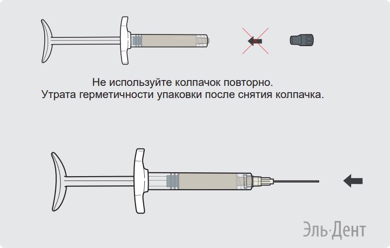 2) После применения отрезать металлический кончик канюли, сохранив остальную часть на месте до следующего применения. Перед следующим пломбированием заменить канюлю 24G на новую.
