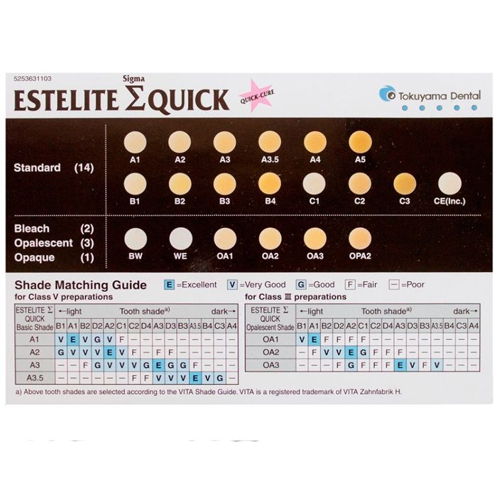 - При работе с материалом следует учитывать его высокую прозрачность. При проведении реставраций для восстановления шейки и тела зуба используют основные оттенки (OA1 OA2 OA3 BW), Эмалевые оттенки применяют для выделения зон прозрачности (режущий край, вершины бугров и эмалевых гребней). Опаковые оттенки Estelite Sigma Quick более прозрачные чем у других производителей. В качестве маскировочного агента и для придания дополнительной опаковости при сквозных реставрациях рекомендуется применять универсальный опак (оттенок OPA2).