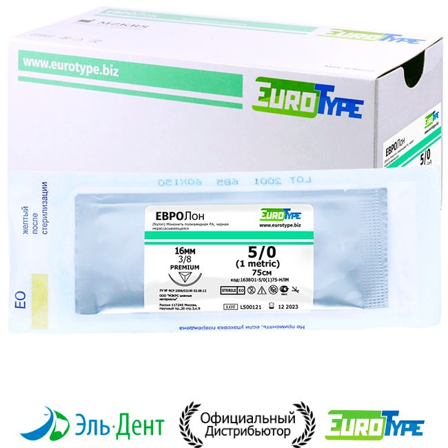 ЕВРОЛОН - это традиционный нерассасывающийся стерильный хирургический шовный материал. Нить полиамидная (нейлон) монофиламентная (мононить). Обладает гладкой поверхностью, легко скользит, имеет низкую фитильность. Материал является условно нерассасывающимся (потеря прочности 20% в год). Имеет высокую прочность и умеренную реактогенность. Для лучшей идентификации нить окрашена в черный цвет. Игла атравматическая Premium из нержавеющей стали, колюще-режущая (таперкат), 1/2 окружности. Высокое качество полировки и специальное соединение нити снижает вероятность травмирования сшиваемых тканей.