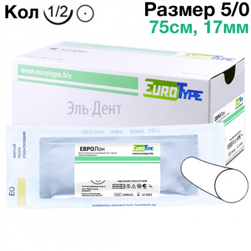 ЕвроЛон 5/0, 75см, 17мм, кол.1/2, 12шт. синтетический монофиламентный нерассасывающийся шовный материал из полиамида 6/6.