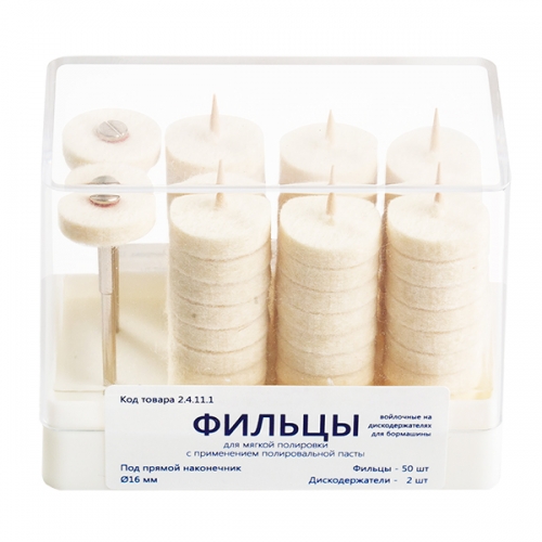 «Фильцы на дискодержателях» войлочные предназначены для зеркального полирования керамических, металлических конструкций зубных протезов с применением полировальных паст.