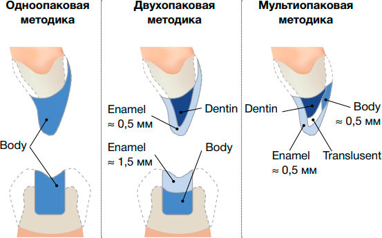 - В соответствии с ожидаемым эстетическим результатом реставрации, выберете одноопаковую, двухопаковую или мультиопаковую методику восстановления, и для правильного подбора оттенков воспользуйтесь шкалой-селектором.