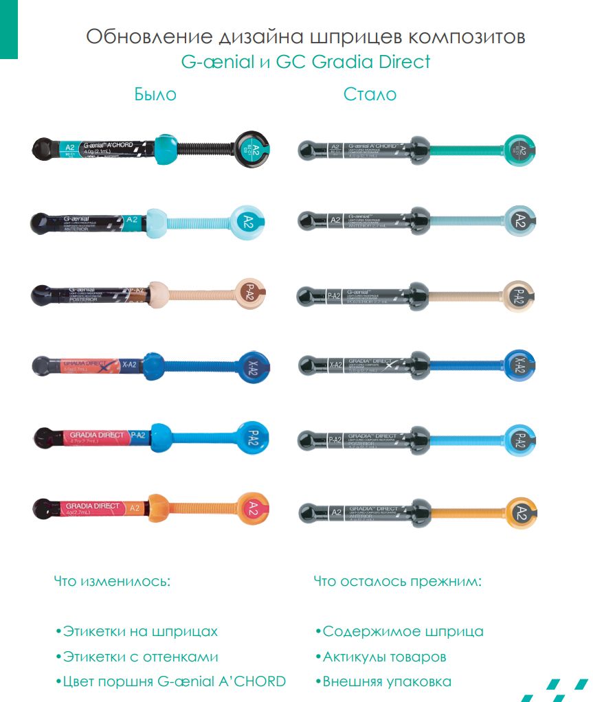 • GC G-anial Anterior удовлетворяет любые эстетические требования – 22 оттенка, 3 степени светопроницаемости: Эмалевые (Внешние/Outside); Дентинные (Стандартные/Standard); Дентинные опаковые (Внутренние/Inside);