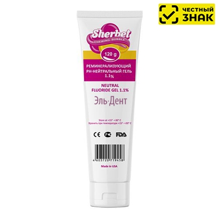 Sherbet Neutral Fluoride Gel 1,1% - это реминерализующий рН-нейтральный гель 1,1% ионов фтора (4.950 ppm) с содержанием кальция и 5 % нитрата калия снижающий повышенную чувствительность.