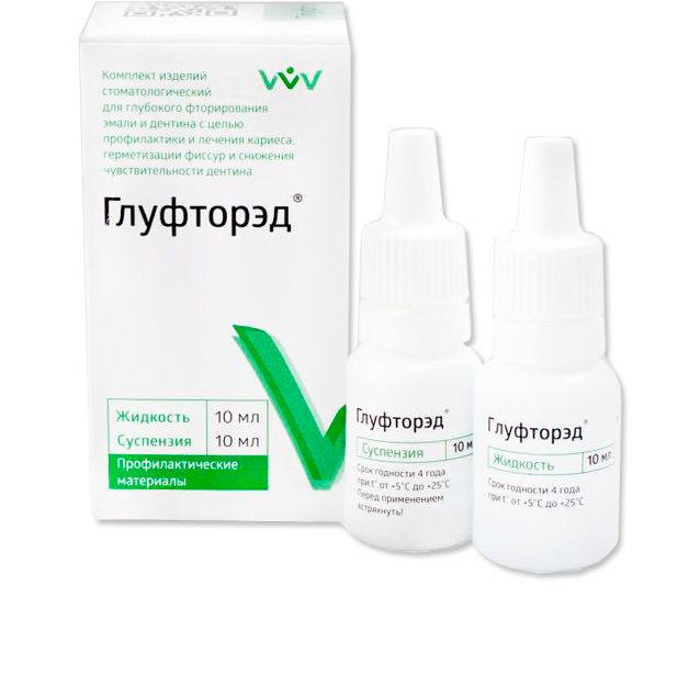 В стоматологический комплект «Глуфторэд» входят: жидкость – раствор голубого цвета, содержащий ионы фтора и меди, суспензия – мелкодисперсная гидроокись кальция в дистиллированной воде с добавлением стабилизатора.
