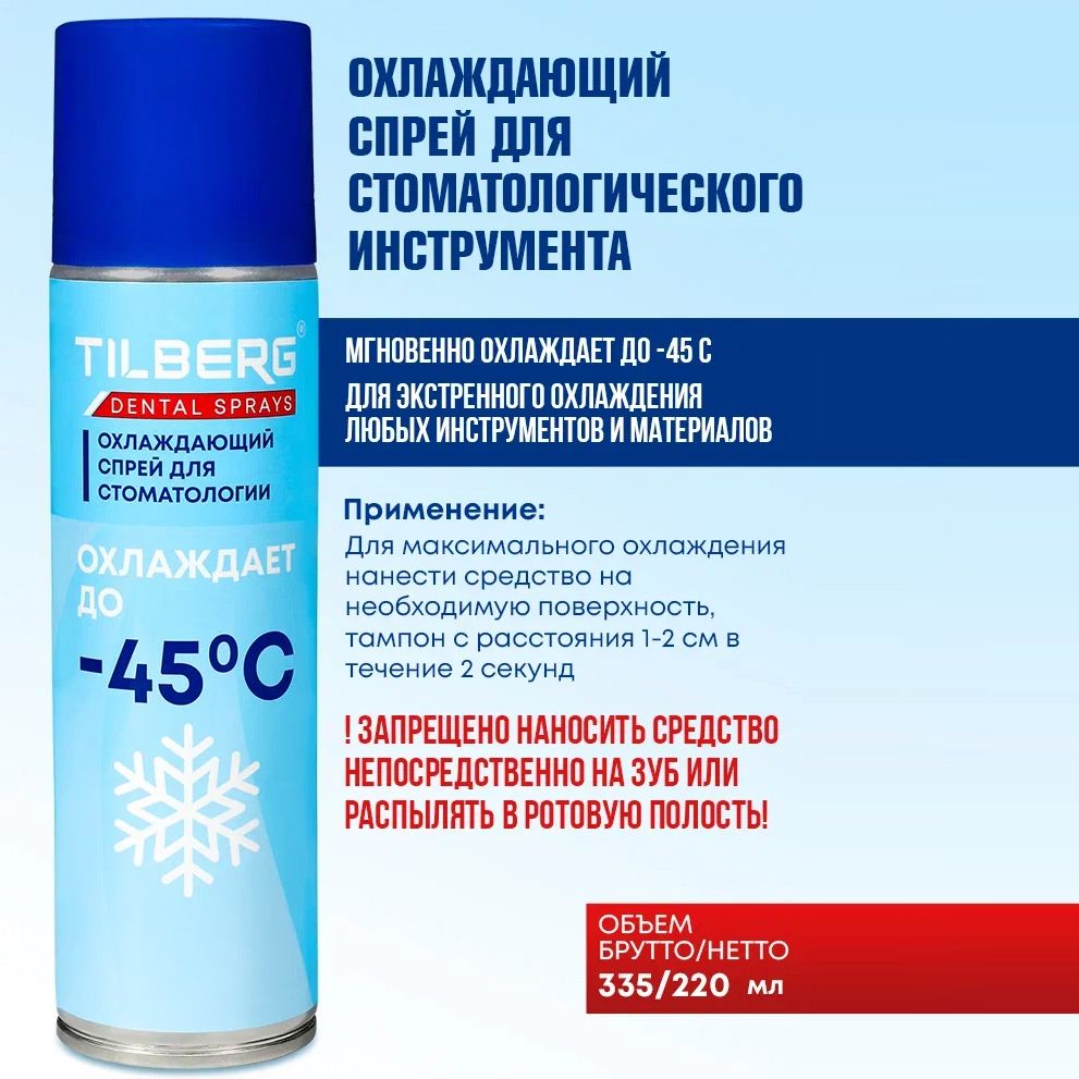 Охлаждающее средство в виде спрея марки TILBERG предназначено для мгновенного экстренного охлаждения инструмента, материалов, используемых в стоматологии, для проведения теста на чувствительность зубов к холоду (фриз-тест, хладопроба).