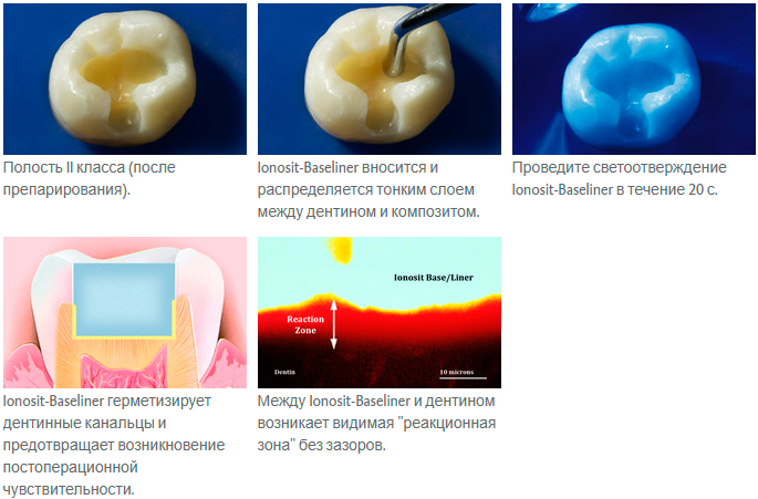 Ionosit-Baseliner наносится слоем толщиной 1 мм между дентином и композитом.