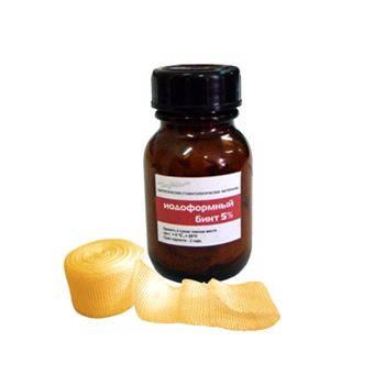 В качестве основы иодоформного бинта используется тампонадный бинт из 100% хлопка в 24 нити с ткаными кромками.100 г бинта содержит 5 г иодоформа.