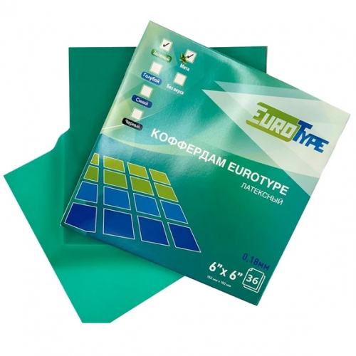 EuroType (Евротайп) – это латексный коффердам зеленого цвета с мятным вкусом, размером 152×152 мм и толщиной 0,18 мм.