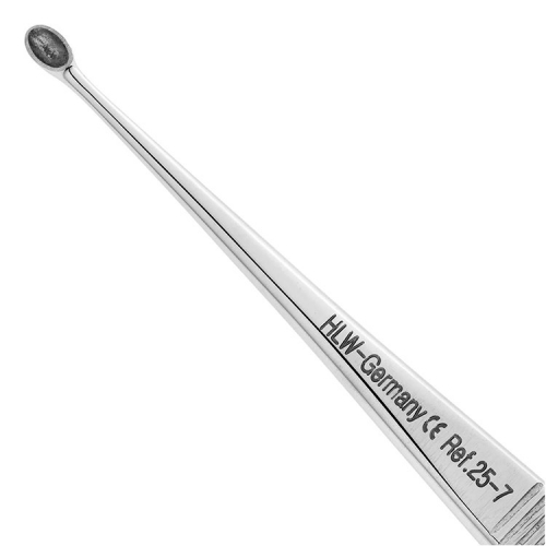 Ложка HLW 25-7 кюретажная Willige, прямая, овальная, 2-2,5 мм в хирургической стоматологии для удаления мелких фрагментов из лунки, а также кюретажа грануляционных тканей двусторонняя кюретажная ложка Williger торговой марки HLW Dental Instruments. Прямой стоматологический инструмент имеет широкую рукоятку, оба конца которой переходят в рабочие части, отличающиеся между собой по размеру. Каждая рабочая часть кюретажной ложки представляет собой чашеобразную форму с острыми гранями. Ширина одной рабочей части 2 мм, другой- 2,5 мм. Такая конструкция инструмента обеспечивает эффективное выскабливание пораженной костной ткани и удаление грануляций из лунок удаленных зубов. На середину плоской кюретажной ложки нанесены поперечные насечки, благодаря которым инструмент надежно фиксируется в руке и позволяет без затруднений провести операцию.