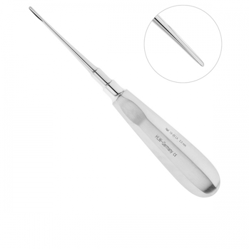 Люксатор HLW 13-21LX прямой, 2 мм применяется для атравматичного удаления корней и зубов на нижней и верхней челюсти. Немецкая компания HLW Dental Instruments является официальным производителем этого инструмента. Щечка люксатора представляет собой тонкое острое лезвие овальной формы. За счет такой конструкции инструмента легко проникнуть между корнем зуба и костной тканью лунки и подрезать периодонтальную связку. При этом удаление корня или зуба происходит намного безопаснее, чем при использовании обычных хирургических стоматологических инструментов. Люксатор надежно фиксируется и не скользит в руке, благодаря граням и выемкам под пальцы на стандартной ручке инструмента. Проводить операцию по удалению корня или зуба люксатором с такой ручкой очень удобно.