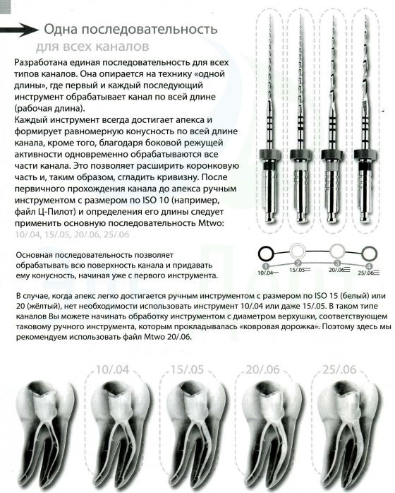 М2, Mtwo files (М2, Мту файлы) — это механические (роторные) эндодонтические инструменты, предназначенные для эндодонтического лечения осложненного кариеса, обладают двумя лезвиями и каждое образует длинную, почти вертикальную спираль, это обеспечивает лучший контроль над продвижением инструмента. Режущая кромка очень острая, что также усиливает режущие качества и обеспечивает прохождение вдоль канала.
