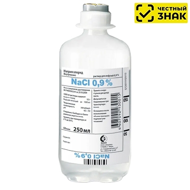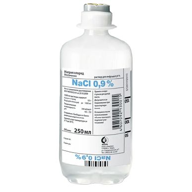 - Симптомы: тошнота, рвота, спастические боли в животе, жажда, пониженное слюно- и слезоотделение, повышенное потоотделение, лихорадка, тахикардия, повышение артериального давления, почечная недостаточность, периферические отеки, отек легких, остановка дыхания, головная боль, головокружение, беспокойство, раздражительность, слабость, мышечные судороги и ригидность, генерализованные судороги, кома и смерть. Избыточное введение раствора натрия хлорида 0,9 % может вызывать гипернатриемию. Избыточное поступление хлорида в организм может приводить к гиперхлоремическому ацидозу. Если раствор натрия хлорида 0,9 % используется в качестве базового раствора для разведения и транспорта других препаратов, симптомы и жалобы при избыточном введении наиболее часто связаны со свойствами добавленных в раствор препаратов. В случае непреднамеренного избыточного введения раствора лечение следует прекратить и оценить состояние пациента.