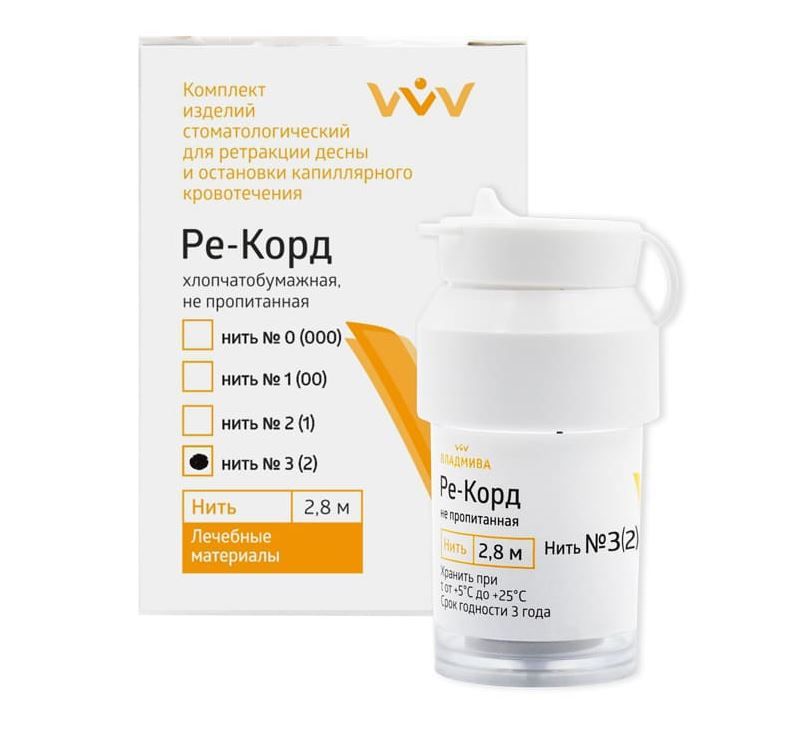 Ретракционные нити «Ре-Корд» изготавливают плетением из хлопчатобумажного волокна, обладающего уникальными абсорбирующими свойствами. Плетение нитей снижает вероятность их разволокнения и включения волокон в оттиски. Темный цвет нитей необходим для легкого обнаружения их в бороздке. Нити «Ре-Корд» выпускают 4-х размеров с маркировкой №0, №1, №2, №3