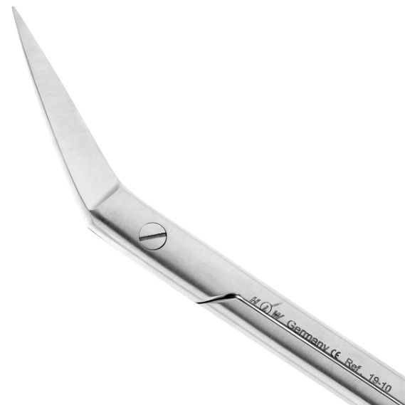 Ножницы HLW 19-10 двойные угловые Locklin,16,0 см предназначены для работы с мягкими тканями челюстно-лицевой области и шовным материалом. Производителем инструмента является компания HLW Dental Instruments. Рабочая часть ножниц стандартной треугольной формы с тонкими, острыми режущими краями. На одном из лезвий инструмента расположены зубчатые режущие грани, предотвращающие скольжение ножниц по поверхности мягких тканей. Инструмент имеет двойной разнонаправленный изгиб по ребру, который облегчает введение ножниц в глубокодоступные участки полости рта и способствует проведению операции по коррекции мягких тканей и шовного материала. Инструмент предназначен для использования как левой, так и правой рукой. Ручки ножниц имеют стандартные кольцевые хваты для указательного и большого пальцев.