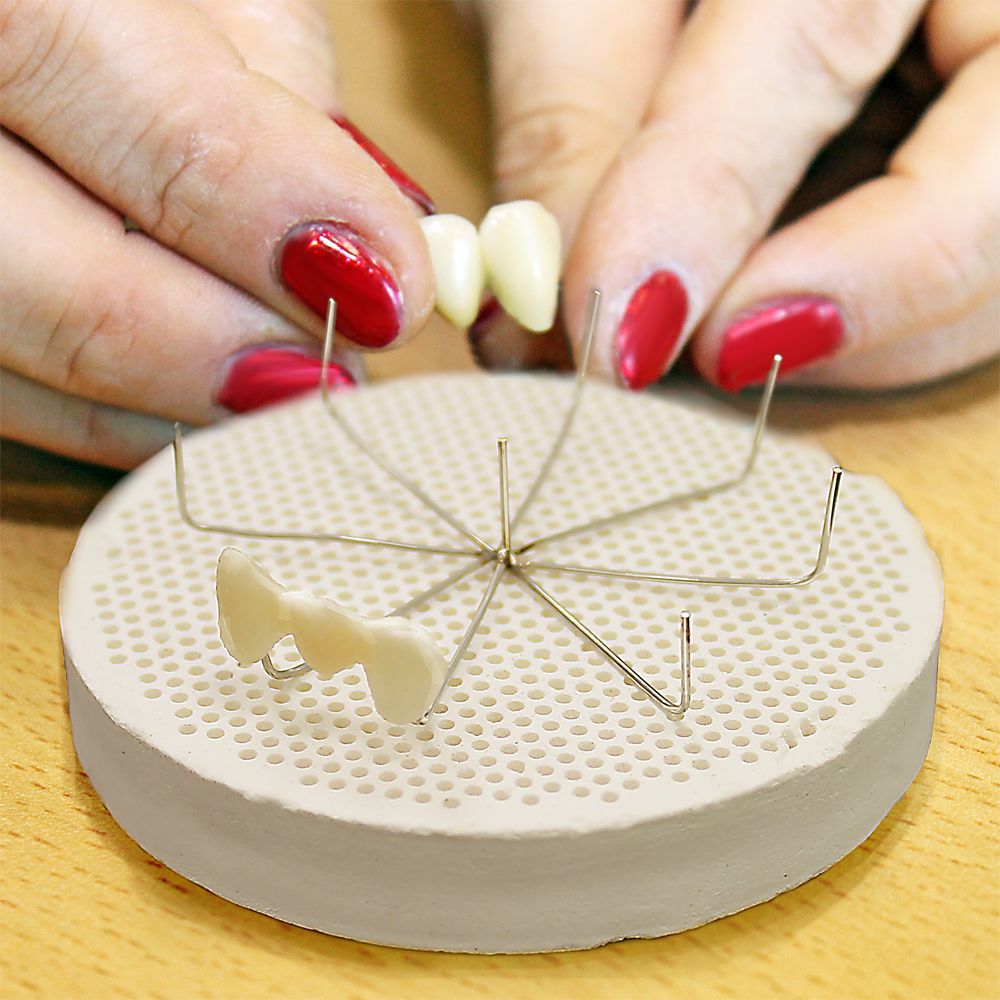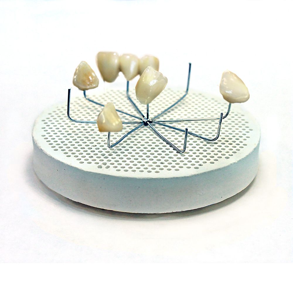 Нихромовая подставка с 9-ю опорами для обжига коронок и мостовидных протезов в электровакуумных печах. Подставка устанавливается на сотовый трегер. Может быть использована для размещения коронок и мостов при облицовке композитами светового отверждения в светоотверждаемом боксе.