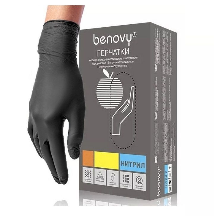 Перчатки Benovy медицинские диагностические (смотровые) одноразовые нестерильные «BENOVY» нитриловые текстурированные на пальцах неопудренные хлорированные (манжета с валиком), черные.