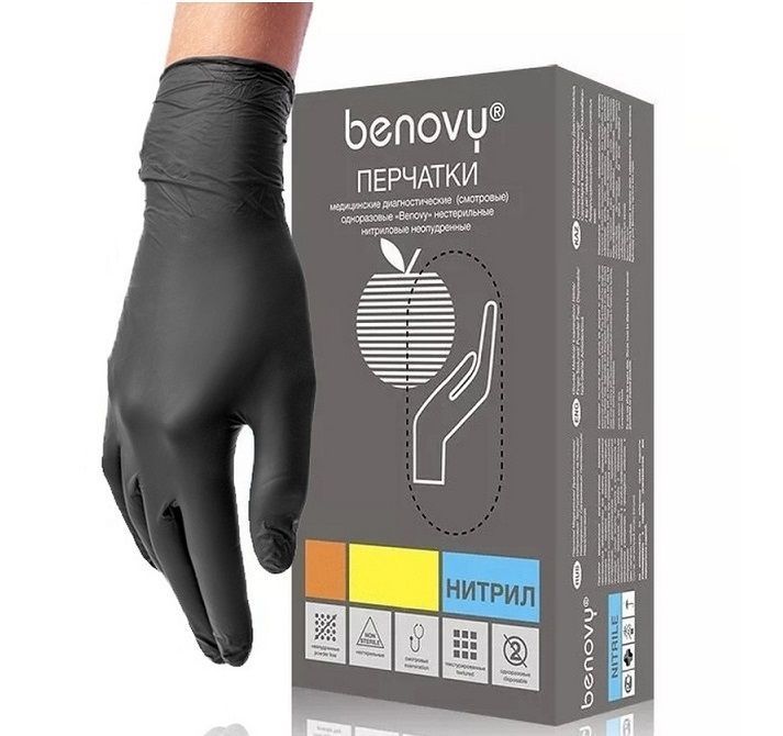 Перчатки Benovy медицинские диагностические (смотровые) одноразовые нестерильные «BENOVY» нитриловые текстурированные на пальцах неопудренные хлорированные (манжета с валиком), черные.