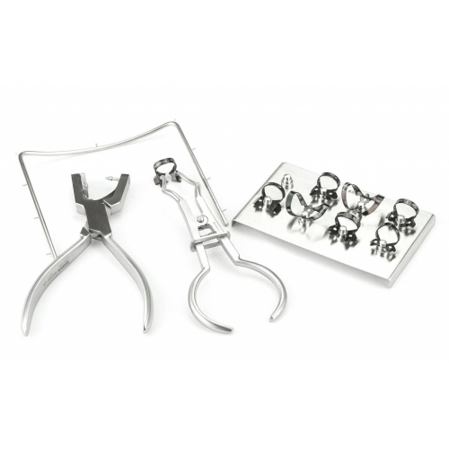 Комплект инструментов и принадлежностей для наложения резиновой завесы Раббер Дам Медента состоит из щипцов для наложения креплений, перфоратора-дырокола, стальных креплений для различных групп зубов, рамки и подставки для креплений. Щипцы для наложения креплений, перфоратор-дырокол, рамка и подставки изготовлены согласно ISO 9001, EN ISO 13485, 93/42/EEC из высококачественной медицинской стали марок AISI 410 и AISI 304.