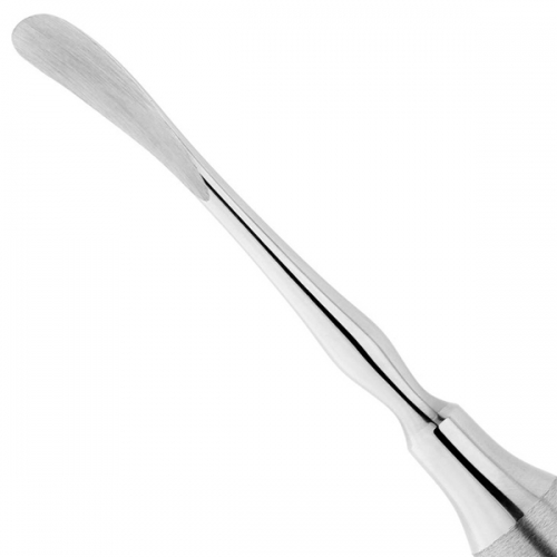 С обоих концов двустороннего инструмента расположены асимметричные рабочие части каплевидной формы шириной 6 и 5 мм. Острая грань с одного края распатора служит для ретракции надкостницы от основной кости, тупая- при фиксации мягких тканей для защиты нерва при использовании вращающихся инструментов.