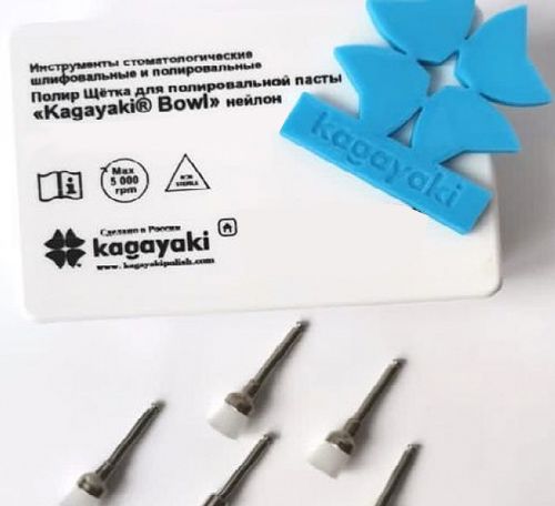 Kagayaki Bowl (Кагаяки Бовл) - это полировочная Щетка которая применяются для удаления мягких и твёрдых зубных отложений с внешней и внутренней поверхности зубов, для быстрой зеркальной полировки окклюзионных и вогнутых поверхностей реставраций из композитов, компомеров, стеклоиономеров и керамики, а также для профилактической обработки в целях обеспечения профессиональной гигиены полости рта. Щеточки предназначены для использования с абразивными пастами марки Kagayaki.