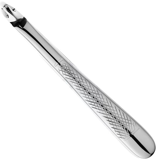 Щипцы 11-33S для удаления нижних корневых зубов, детские разработаны немецкой фирмой HLW Dental Instruments для удаления корней молочных зубов на нижней челюсти. Рабочие поверхности инструмента узкие с продольно-поперечными насечками на внутренней стороне, закругленные на концах и несходящиеся при смыкании. Щечки клювовидных щипцов расположены под углом 90° относительно продольной оси инструмента. При удалении корней зубов на нижней детской челюсти такая конструкция обеспечивает надежную фиксацию щипцов на корне и дает возможность ввести инструмент глубоко в полость рта. Наружная поверхность стандартных ручек покрыта ретенционным узором, предотвращающим скольжение фаланг пальцев в перчатке. Небольшой размер инструмента разработан согласно детским анатомическим особенностям.