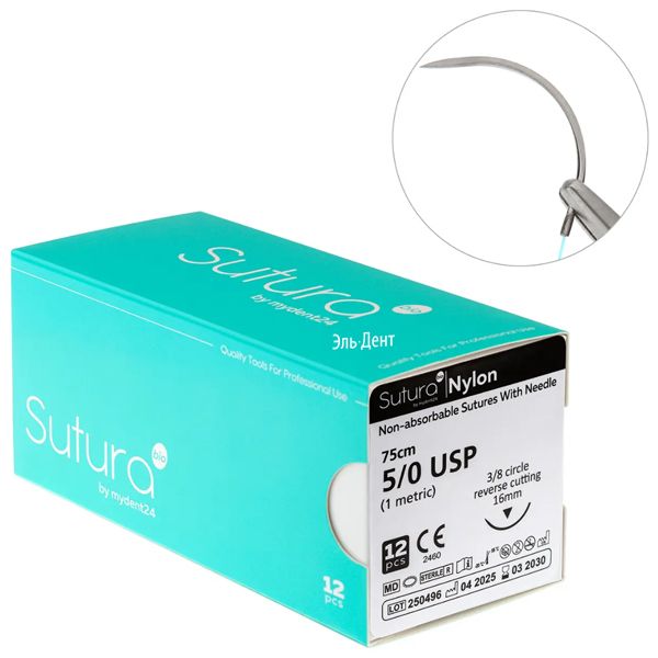 Шовный материал NYLON 5/0_75_16, нерассасывающаяся, 3/8, обратно-режущая (12 шт.), SUTURA
