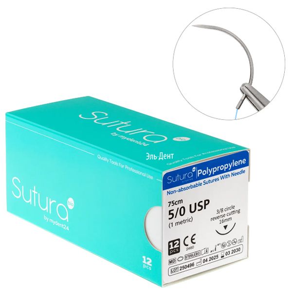 Шовный материал POLYPROPYLENE 5/0_75_16, нерассасывающаяся, 3/8, обратно-режущая (12 шт.), SUTURA