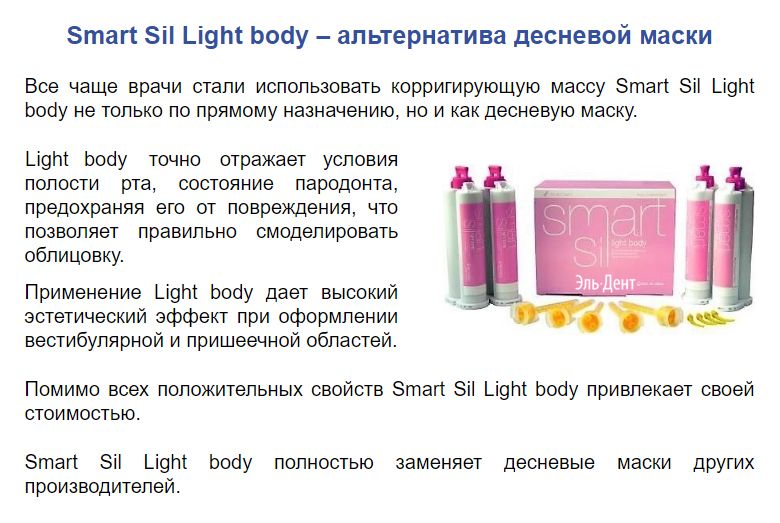 - Smart Sil light body может полностью заменить в работе десневые маски других производителей.
