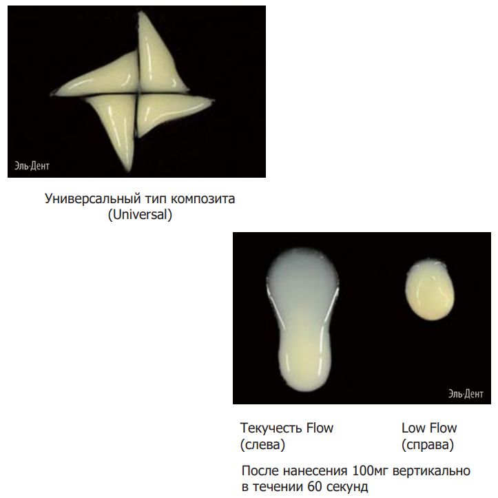 Универсальный композит легко отделяется от шпателя, но из-за вязкости наносить его нужно равномерно. Композиты Flow и Low Flow имеют соответствующую текучесть, их можно наносить или заполнять ими отверстия в соответствии с клиническим случаем.