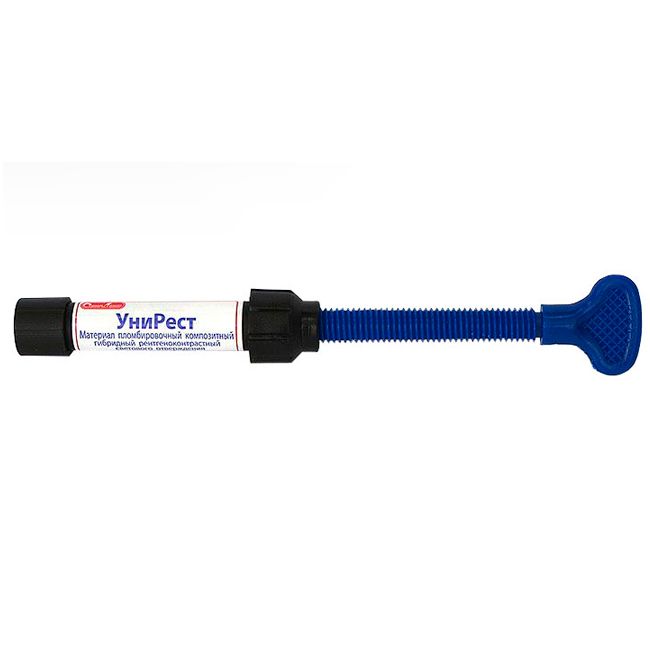 Композитный пломбировочный материал «УниРест» предназначен для реставрации зубов I-VI класса взрослых и детей. Представляет собой пломбировочную композитную пасту, которая отверждается светом длиной волны 450÷500 нм, расфасованную в светонепроницаемые шприцы (контейнеры).
