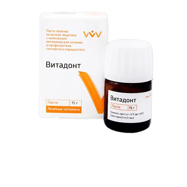 «Витадонт» - антибактериальная паста-повязка, представляет собой витаминизированный комплекс на основе воско-лецитиновой композиции, содержащий бета-каротин, витамин Е и С. Паста оказывает успокаивающее и обезболивающее действие.