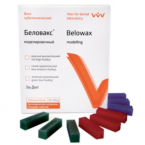 Беловакс М моделировочный воск, три типа текучести (красный, синий и зелёный), предназначен для изготовления вкладок, коронок, вставок, литых кламмеров, полукоронок, дуг и каркасов бюгельных и мостовидных протезов методом литья по выплавляемым моделям. Моделировочный воск Беловакс красного цвета обладает высокой текучестью и используется для моделирования пришеечной части коронок.