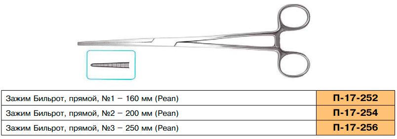 Зажим Бильрота имеет на браншах насечки, которые захватывают сосуды (или ткани) деликатно, но непрочно. Зажимы типа Бильрот бывают с прямыми или изогнутыми рабочими частями. Обязательно кровоостанавливающий зажим имеет зубчатый фиксатор - кремальеру.