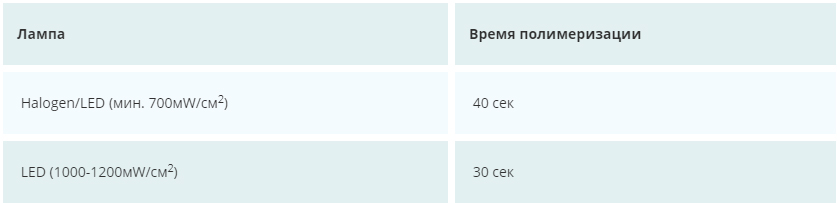 - Если необходимо, можно нанести несколько слоёв Glaze, отверждая каждый слой согласно таблице полимеризации.